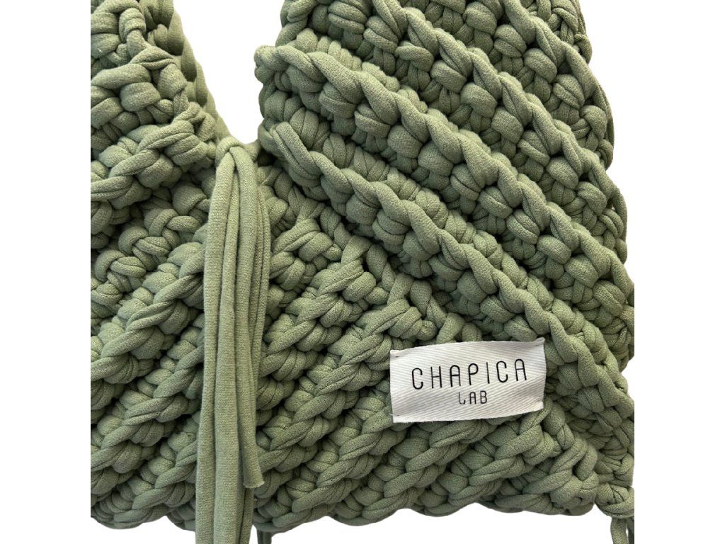 Kabelka má praktické ucho, ktoré je tiež ručne háčkované z rovnakej bavlnenej tričkoviny, takže pôsobí kompaktným a harmonickým dojmom. Je ideálnym doplnkom na bežné nosenie, letné dni, mestské prechádzky alebo ako výrazný detail k jednoduchému outfitu.